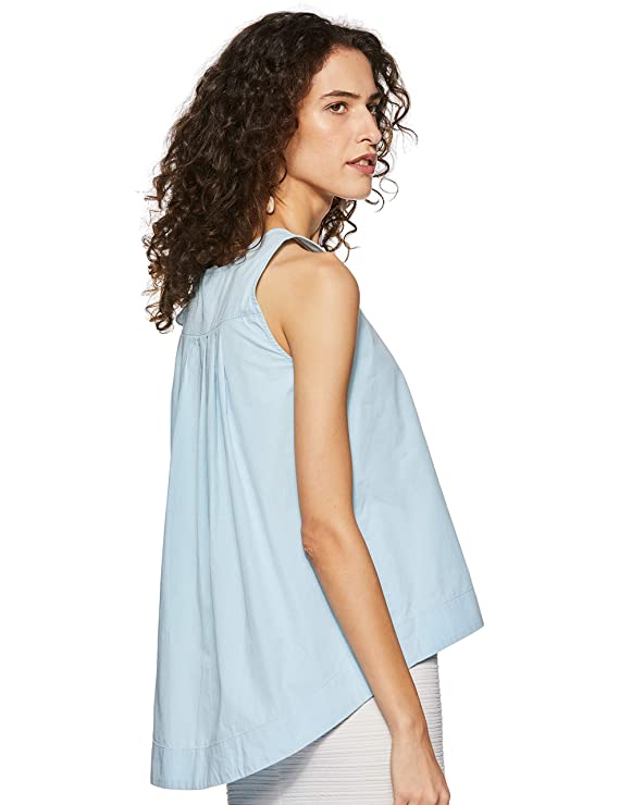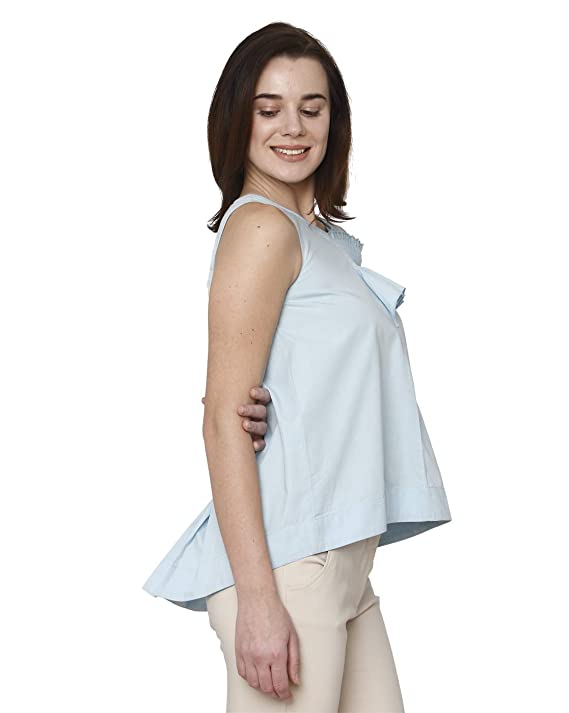 MODA Women Light Blue Solid U-Neck Sleeveless Regular Fit Cropped / Short Casual Wear High-Low Top